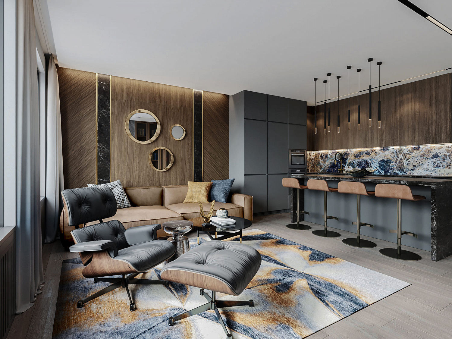 Изящный интерьер выполнен в светлых тонах со стильными предметами дизайна, напоминающими воздушные пентхаусы в Нью-Йорке или Чикаго. Элементы Art Deco и Mid-century Modern характеризуют хозяина квартиры, как человека утонченного, понимающего искусство и моду. Золотые элементы интерьера подчеркивают изысканность пространства.